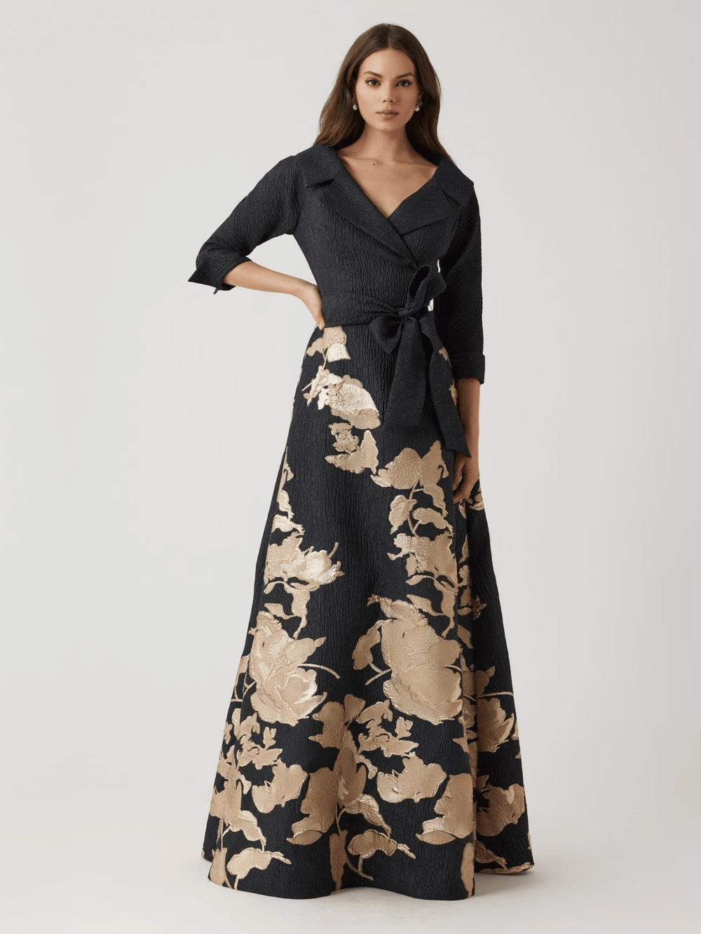 Das Metallic Floral Abendkleid von Teri Jon kombiniert luxuriösen Jacquard in Schwarzgold mit einem eleganten Kragenausschnitt und 3/4-Ärmeln für zeitlose Raffinesse. Die abnehmbare Schärpe betont die Taille, während der volle Rock mit seinem metallisch schimmernden Blumenmuster jedem Auftritt eine dramatische, glamouröse Note verleiht – perfekt für Galas, Black-Tie-Events und elegante Abende.