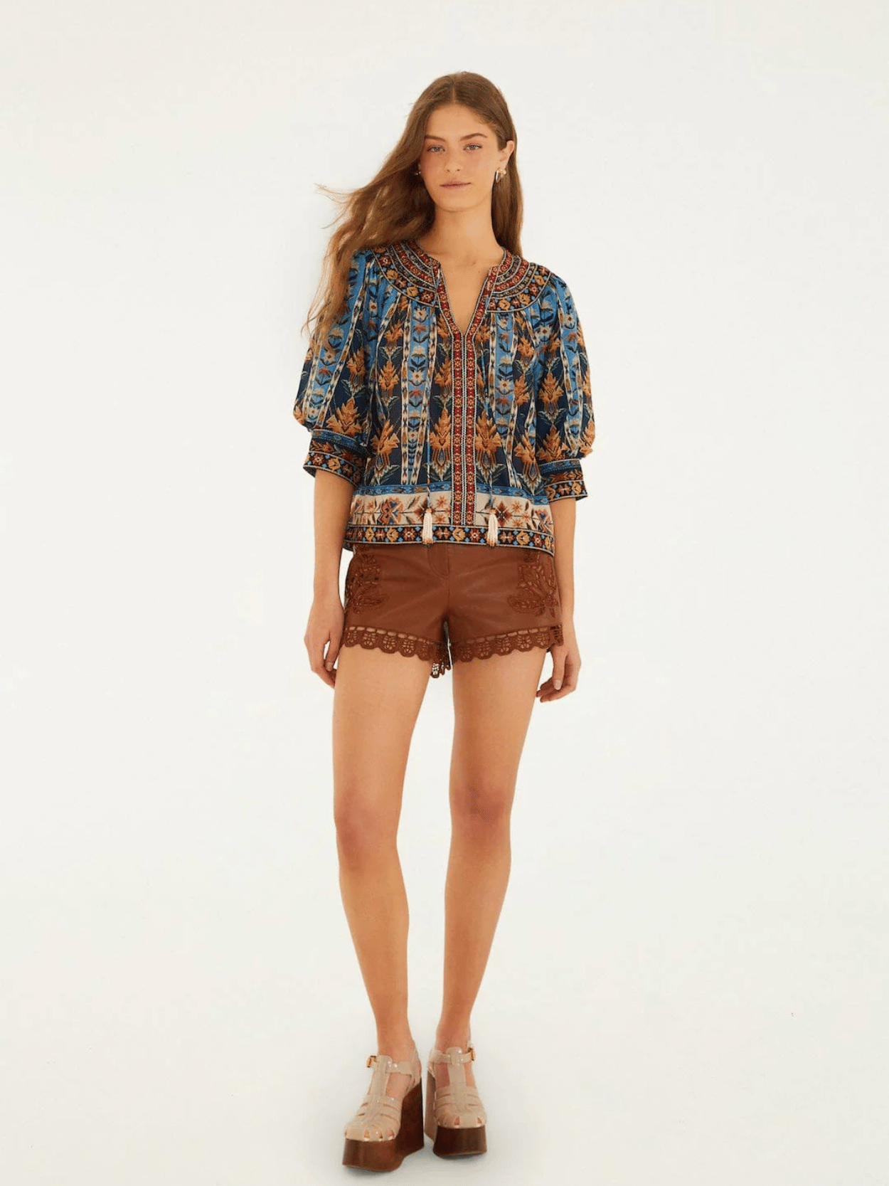Die Tapestry Bluse von FARM Rio verbindet kunstvolle, tapestry-inspirierte Stickereien mit lebendigen Blautönen zu einem ausdrucksstarken Look. Puffärmel, dekorative Quasten und der feminine Rundhalsausschnitt verleihen der Bluse eine verspielte Boho-Note. Eine bestickte Boho-Bluse, die Farbe, Leichtigkeit und besonderen Stil in jede Garderobe bringt.