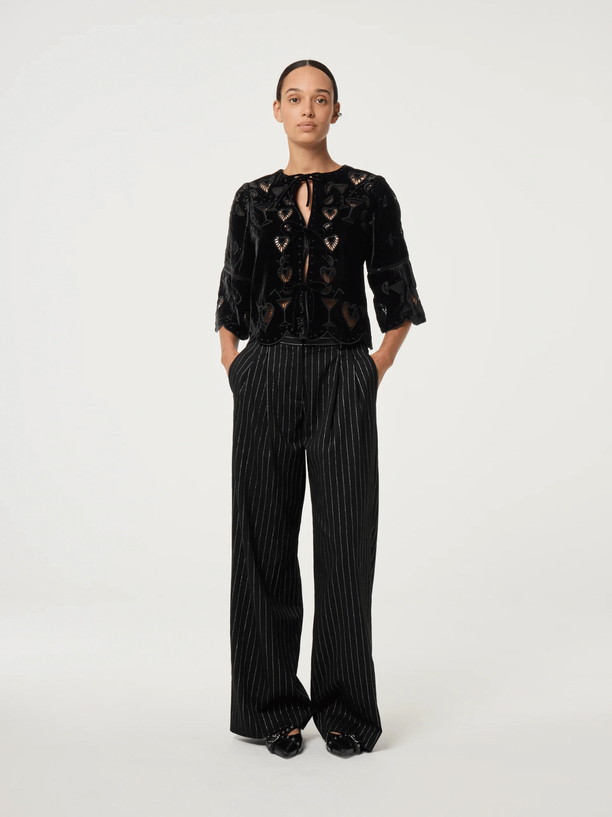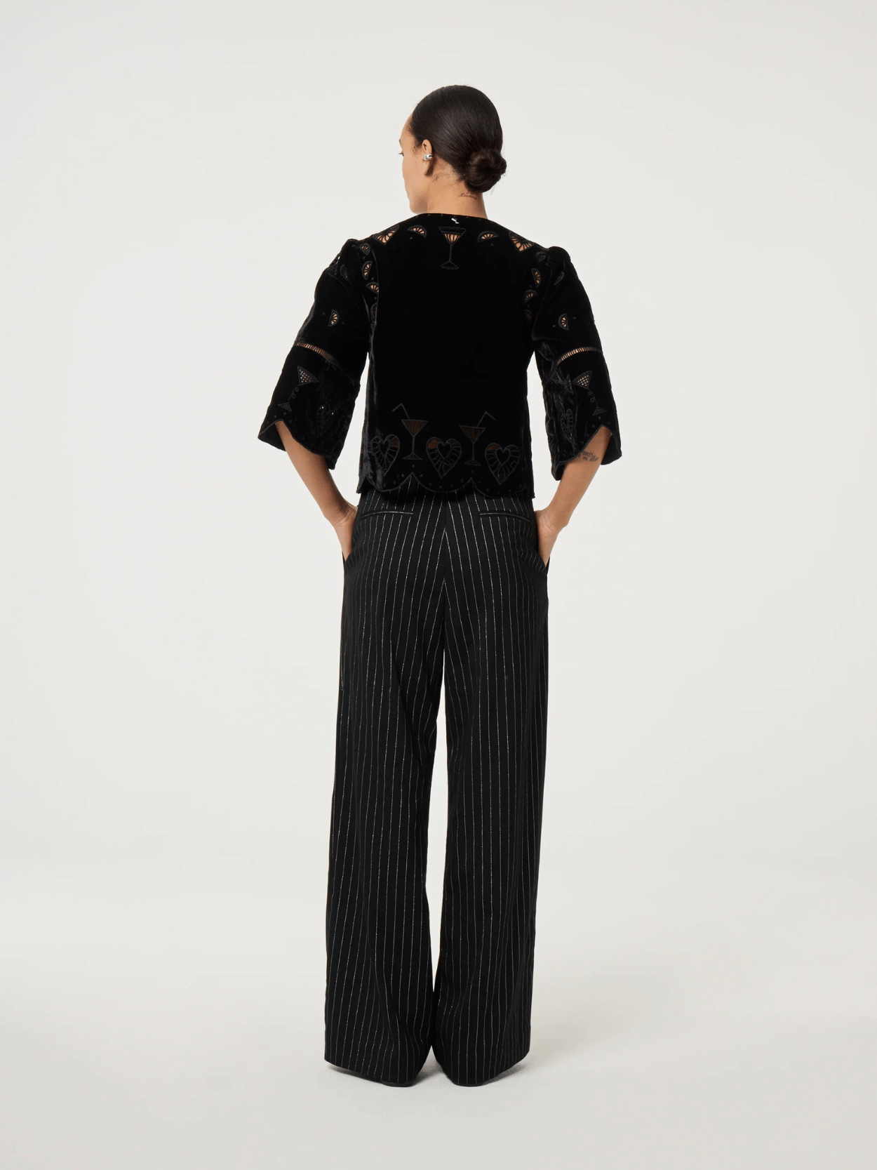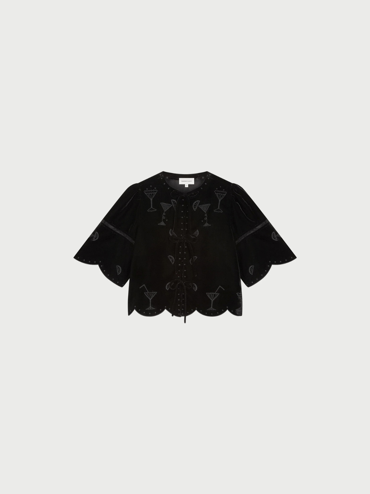 Die Roarie Bluse in Schwarz von Fabienne Chapot vereint verspielten Charme mit eleganter Raffinesse. Die zarten Stickereien in Cocktailglas-Motiven und die weit geschnittenen Ärmel verleihen der Bluse einen einzigartigen Look. Aus leichtem Polyester gefertigt, ist sie das ideale Statement-Piece für stilvolle Auftritte – ob zu Jeans, Rock oder eleganter Hose.
