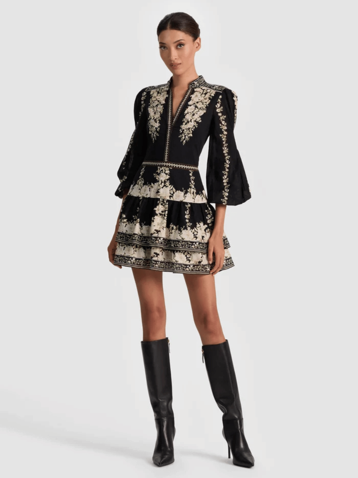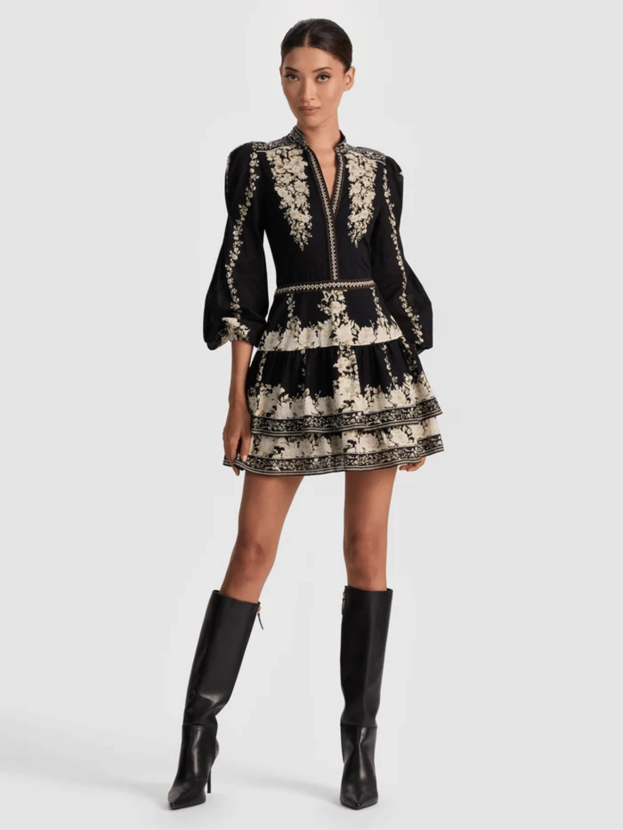 Das Valencia Minikleid von Alice & Olivia verführt mit voluminösen Ballonärmeln, tiefem V-Ausschnitt und einer femininen Stufenrock-Silhouette aus leichter Baumwoll-Voile. Verspielte Knopfdetails und das elegante Boho-Design machen es zum perfekten Begleiter für moderne Herbstabende – frisch, stilvoll und mit einem Hauch verführerischer Leichtigkeit.