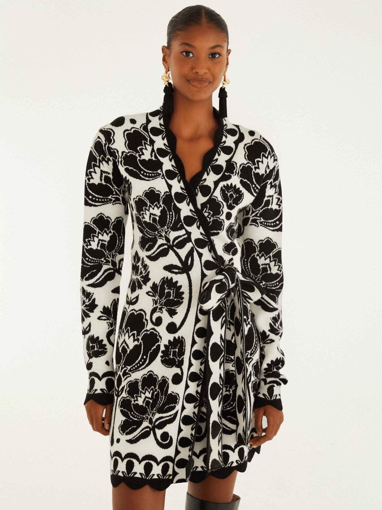 Erleben Sie stilvolle Eleganz mit dem Black and White Arabesque Wickelkleid von FARM Rio. Das weiche Strickmaterial mit kontrastierendem Arabesken-Blumenmuster schmeichelt Ihrer Figur dank der femininen Wickel-Silhouette und dem Bindegürtel in der Taille. Zarte Wellenkanten und ein V-Ausschnitt verleihen diesem Kleid einen verspielten, modernen Charme – perfekt für stilbewusste Auftritte zu jeder Jahreszeit.
