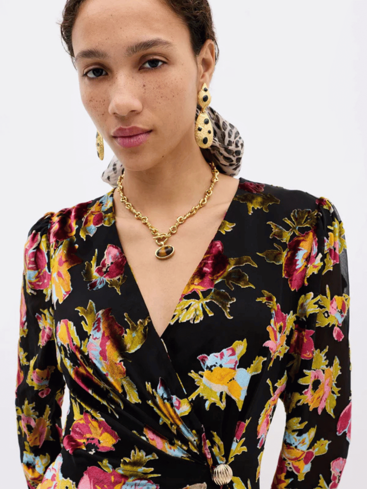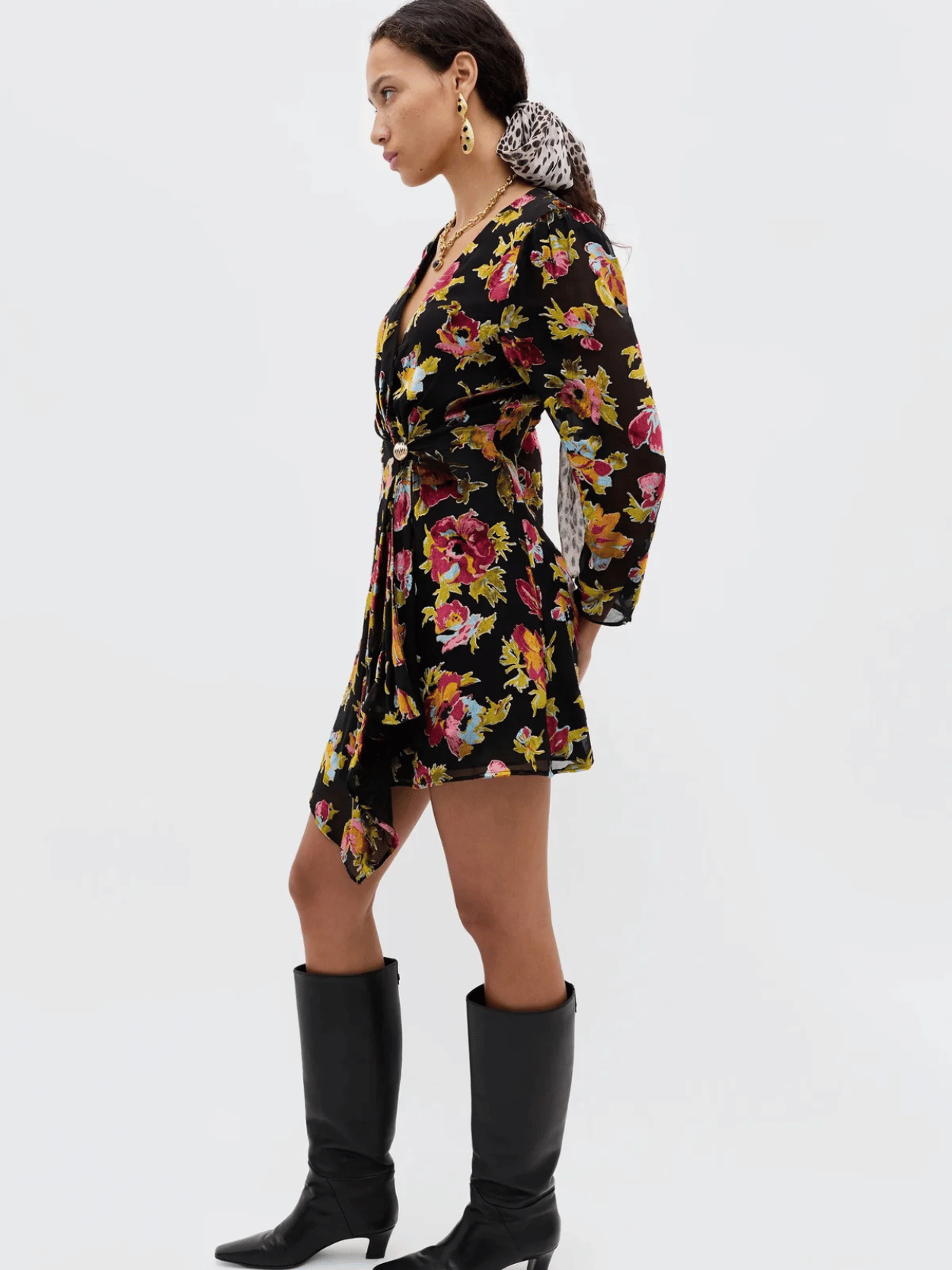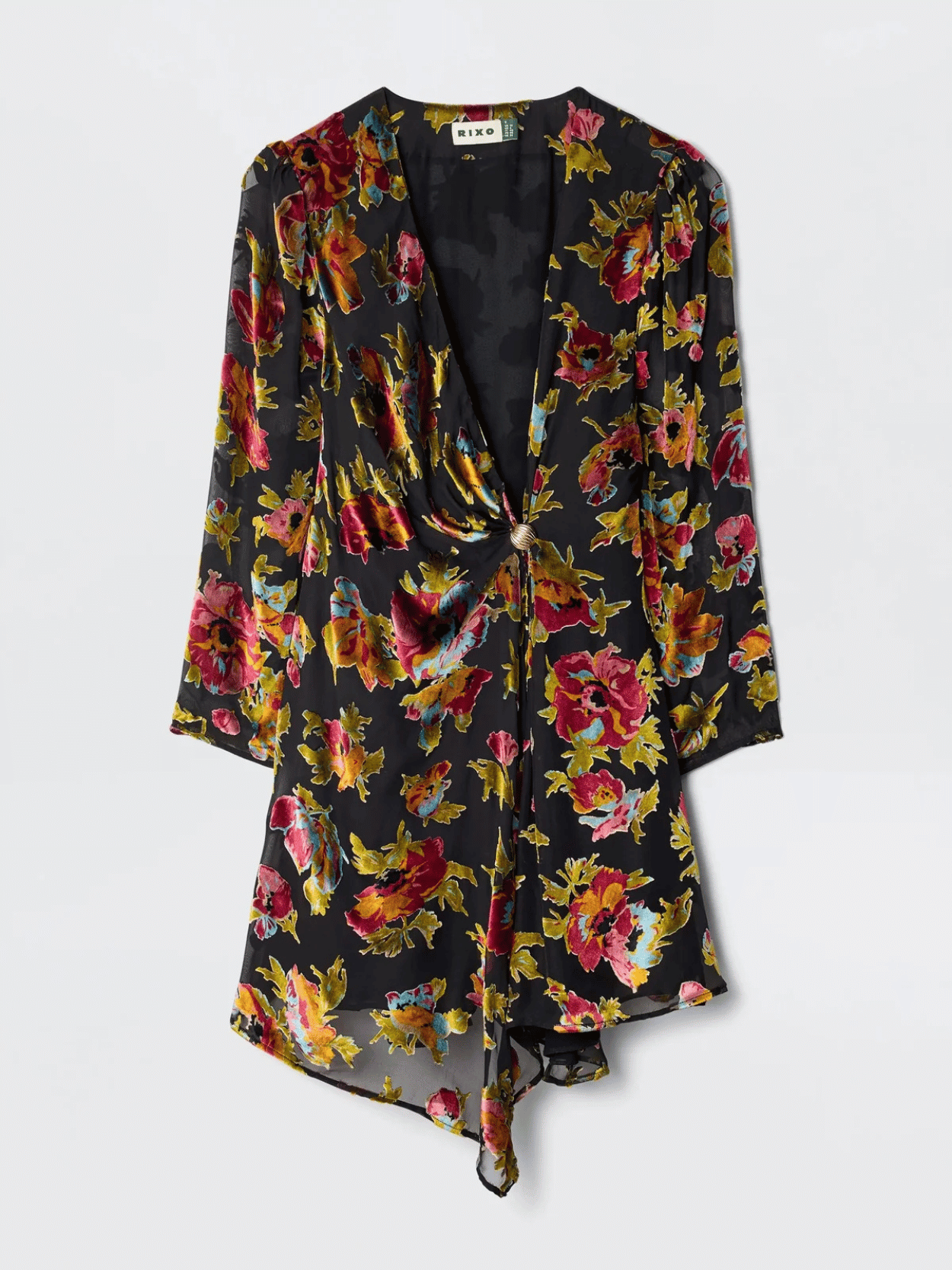 Das Kensley Minikleid von Rixo ist kurz, elegant und voller 80er-Jahre-Charme. Der luxuriöse Devoré-Stoff mit leuchtendem Blumendruck, die feminine Wickeloptik und der goldene Knopf verleihen dem Kleid einen raffinierten, sinnlichen Look. Mit seinem asymmetrischen Saum ist es das perfekte Cocktailkleid für moderne Frauen, die Stil und Selbstbewusstsein ausstrahlen.