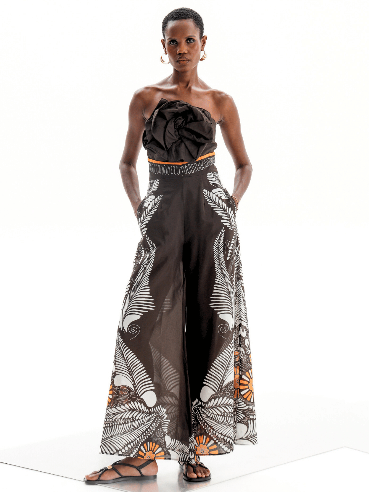 Der schwarze Overall von Lace the Label besteht aus einem leichten Viskose-Baumwoll-Mix und fühlt sich besonders dünn und luftig auf der Haut an. Eine markante Blumenapplikation im Brustbereich setzt einen ausdrucksstarken Akzent. Das weite Bein sorgt für eine fließende Silhouette und einen modernen Look – ideal für warme Tage und besondere Anlässe.