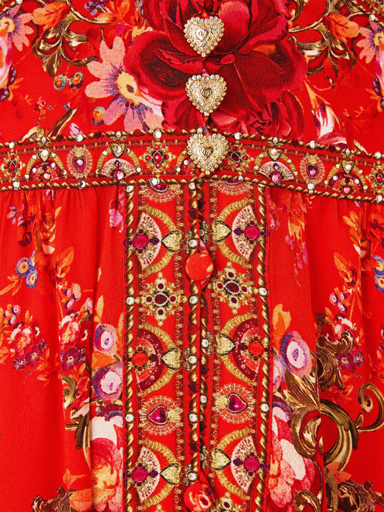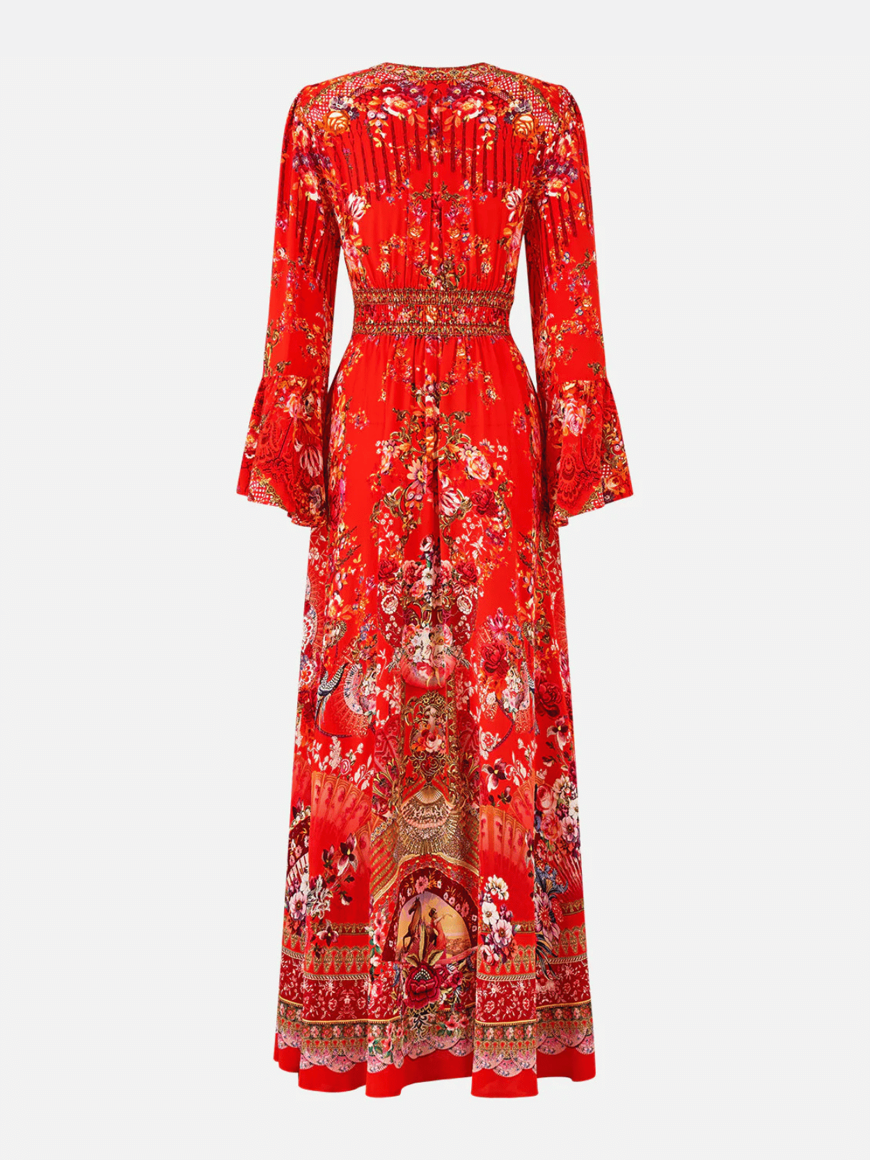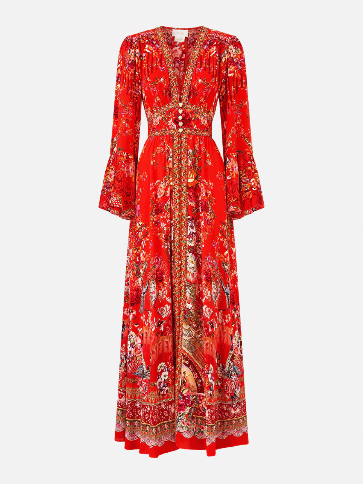 Das CAMILLA Shaped Waistband Dress With Ruffle Sleeve Olé Olé begeistert mit opulentem Print in leuchtendem Rot und luxuriöser Seide. Der feminine V-Ausschnitt, die geformte Taille und der gesmokte Rücken formen eine elegante Silhouette, während fließende Volantärmel und Kristallverzierungen glamouröse Akzente setzen. Ein ausdrucksstarkes Maxikleid mit perfekter Balance aus Struktur und Leichtigkeit.