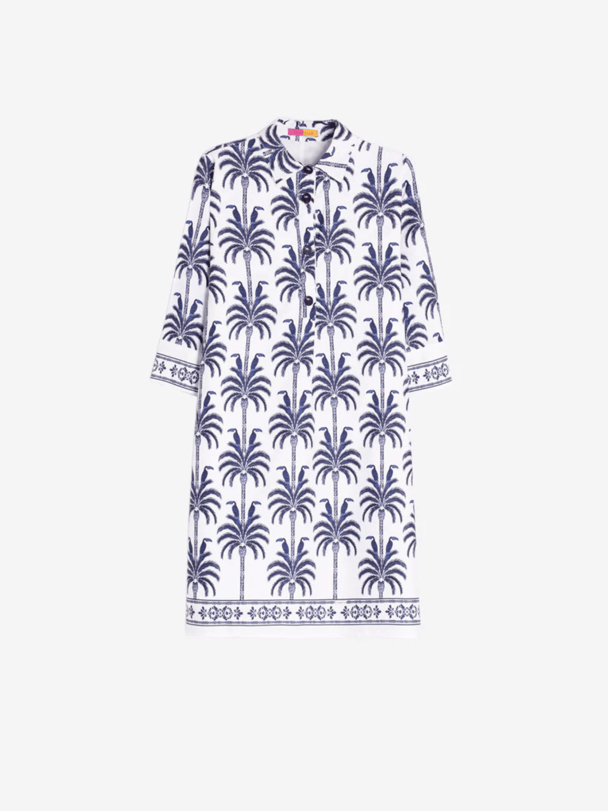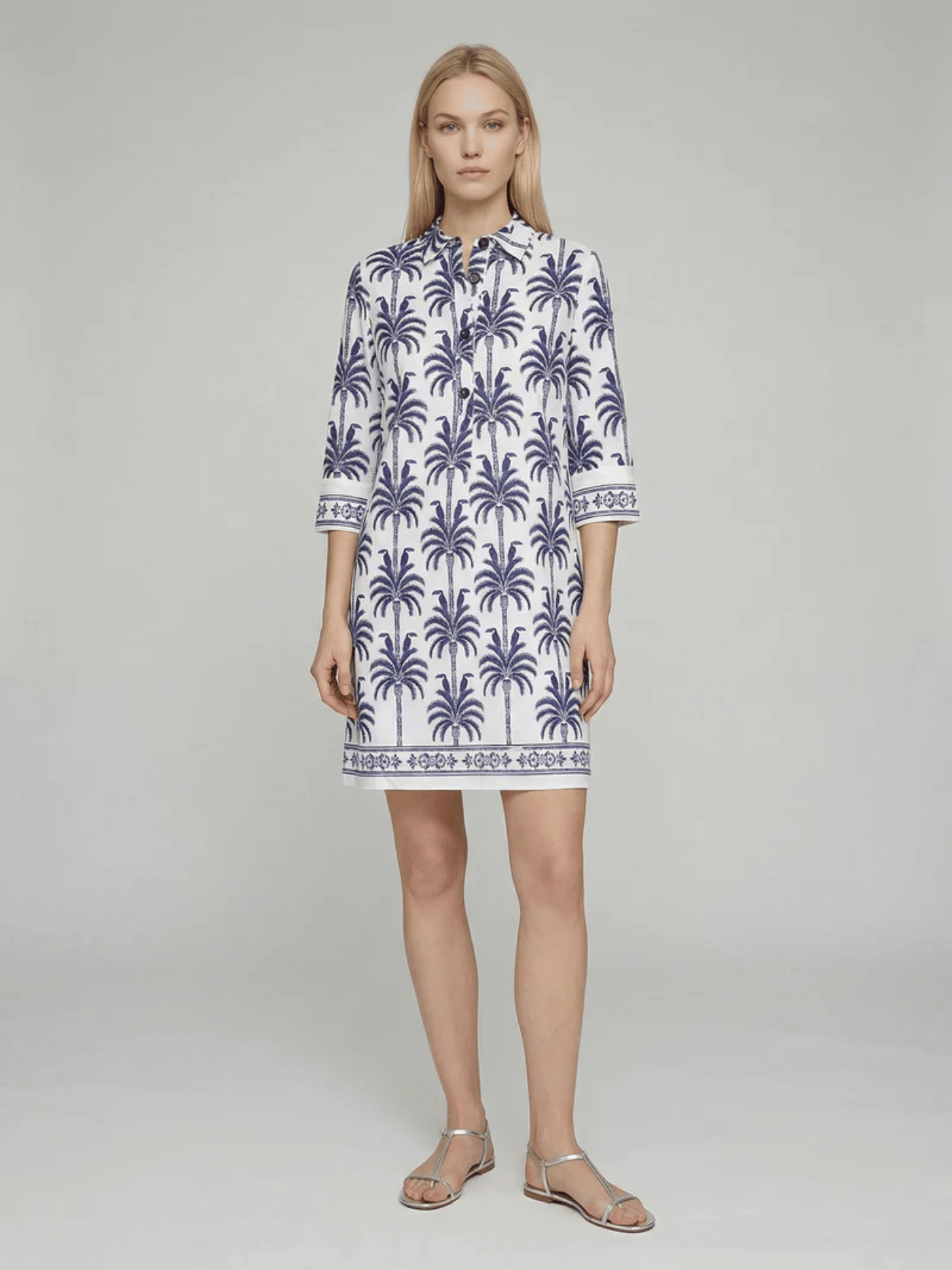 Das Kleid Miranda von Vilagallo begeistert mit einem exotischen Allover-Print aus Palmen- und Tukanmotiven sowie dekorativen Bordüren. Der gerade, leichte Schnitt mit 3/4-Ärmeln und Knopfleiste sorgt für angenehmen Tragekomfort und eine moderne, sommerliche Ausstrahlung. Perfekt für Urlaub, warme Tage und stilvolle Freizeit-Looks.