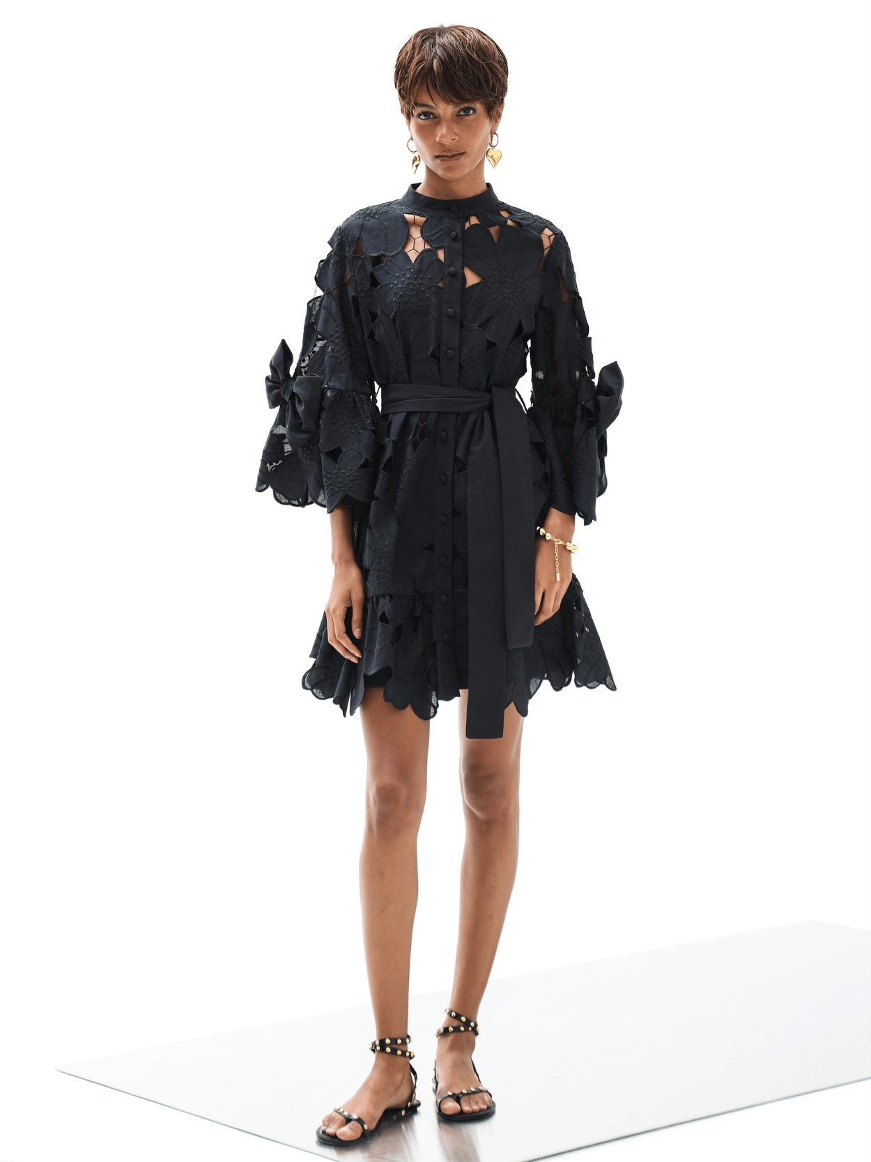 Dieses schwarze Kleid aus 100% Baumwolle ist mit dekorativer Spitze und einem Unterkleid ausgestattet. Der lockere Schnitt wird durch den Gürtel feminin ergänzt. Die Schleifen an den Ärmeln verleihen dem Look eine verspielte Note und sind ein besonderes Highlight. Das Kleid ist ideal für elegante Sommerabende oder besondere Events.