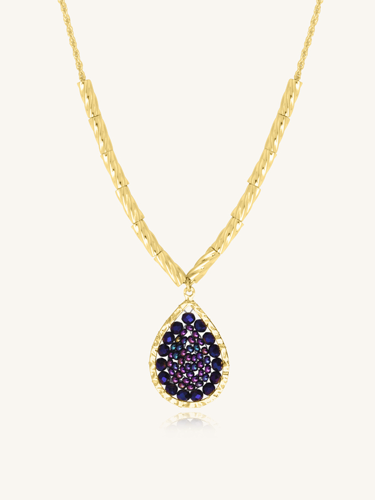 Die Ysé-Halskette von Santibe Paris vereint zarte Eleganz mit strahlender Brillanz. Die feine, vergoldete Kette trägt einen tropfenförmigen Anhänger, der dank schwebender rechteckiger Perlen und funkelnder Kristalle wie eine schimmernde Wasserperle wirkt. In sorgfältiger Handarbeit gefertigt, verleiht dieses Collier jedem Look einen edlen, modernen Akzent.