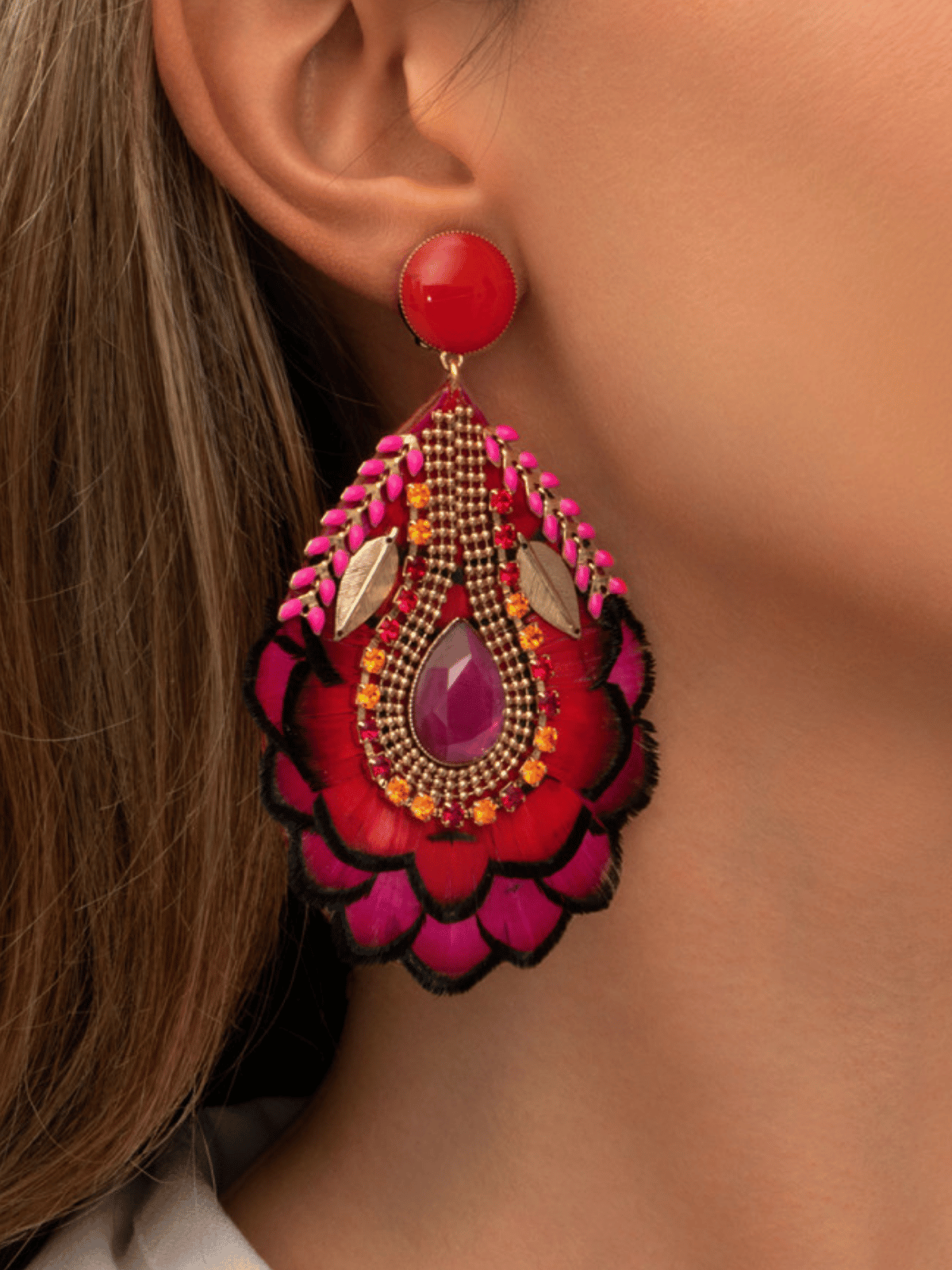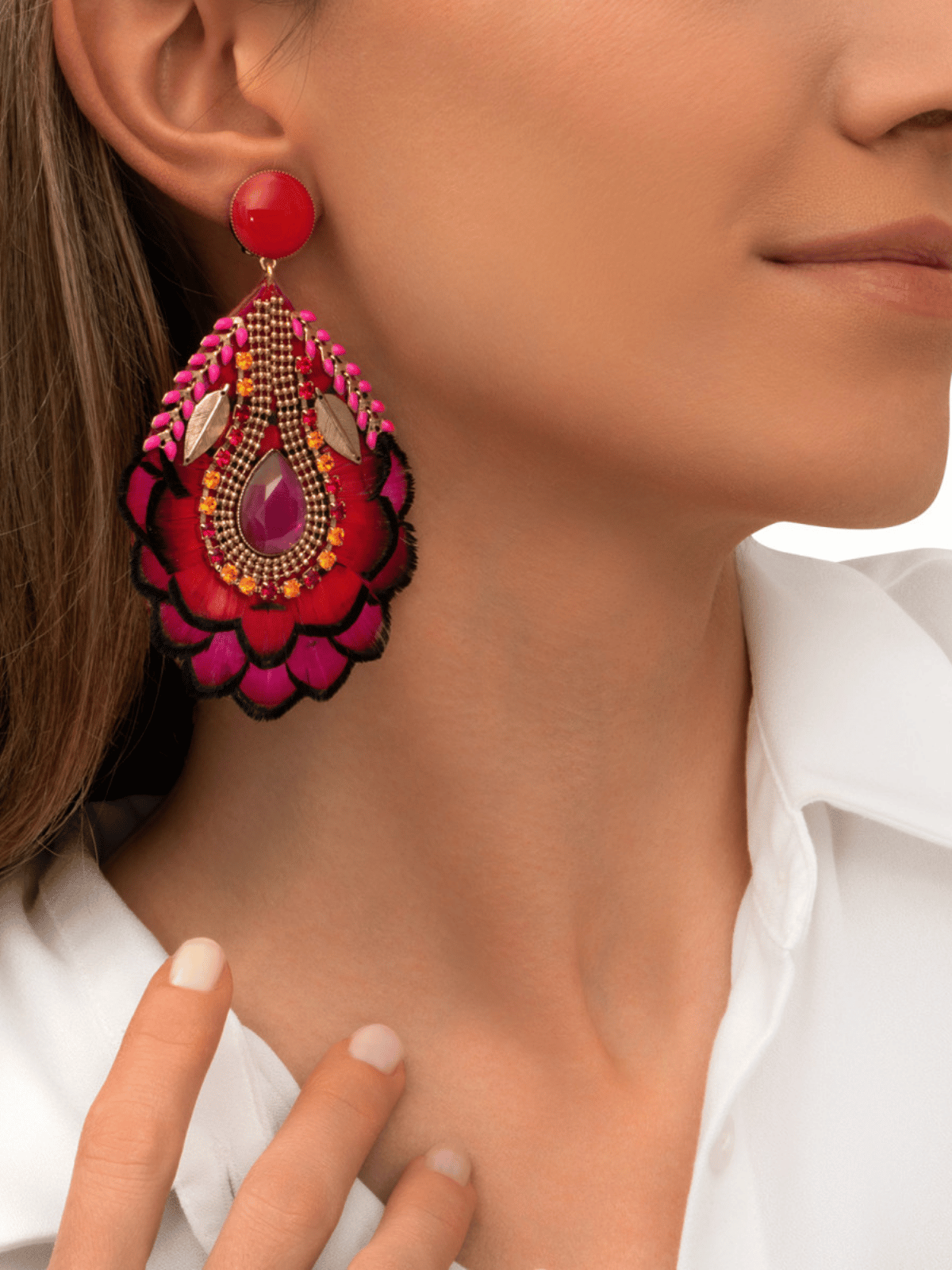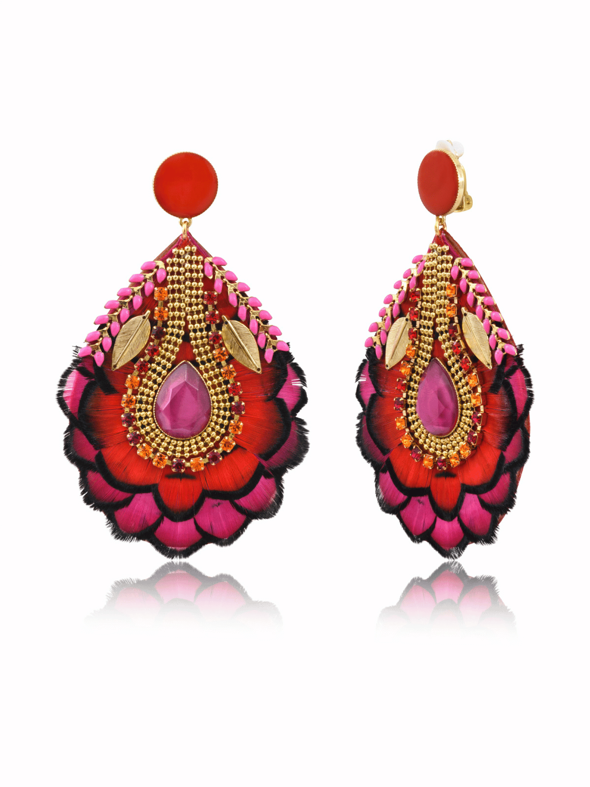 Elegant, farbenfroh und außergewöhnlich: Die Alizia Ohrclips mit Federn von Satellite vereinen kunstvolle Handwerkskunst mit modernem Design. Gefärbte Naturfedern, funkelnde Kristalle und ein fuchsiafarbener Cabochon aus Glaspaste schaffen ein glamouröses Highlight, das jedem Outfit einen Hauch von Haute Couture und raffinierter Leichtigkeit verleiht – perfekt für besondere Anlässe oder stilvolle Abende.