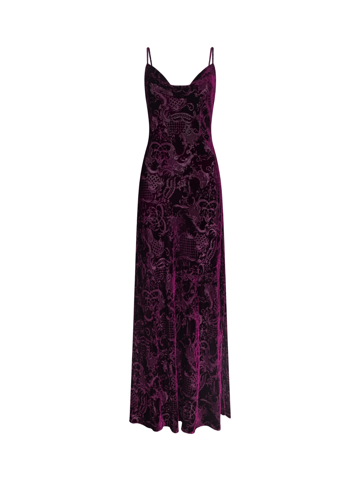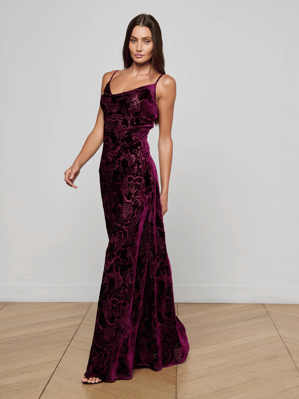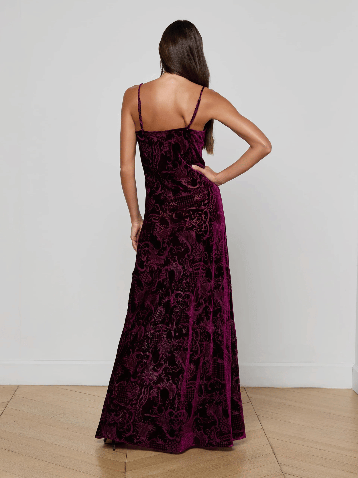 Das Christine Samtkleid von L’Agence besticht durch luxuriösen Burnout-Samt in tiefem Burgunderton und eine elegant fließende, schräg geschnittene Silhouette. Verstellbare Träger und der weiche, ungefütterte Stoff sorgen für eine sinnlich-leichte Ausstrahlung. Ein edles Statement-Piece für stilvolle Abende und besondere Anlässe.