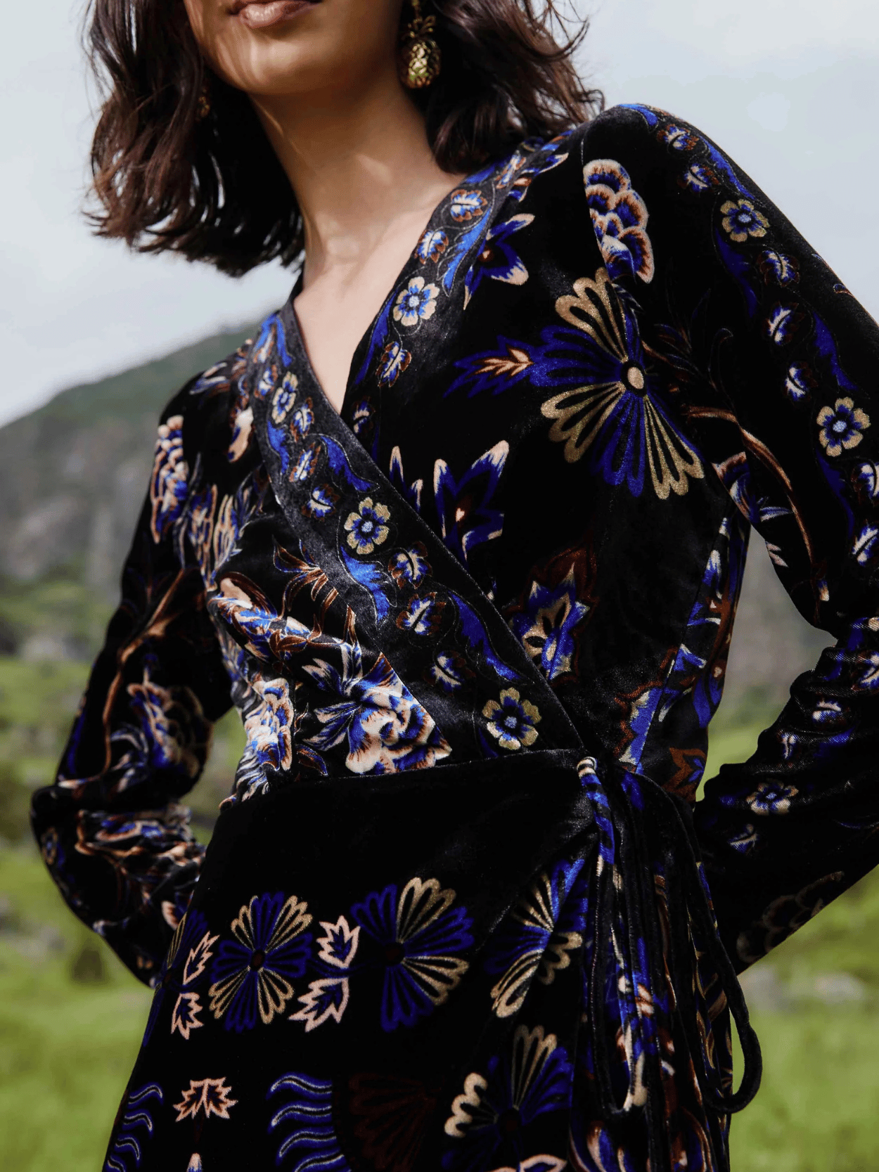 Das Arabesque Mix Minikleid von Farm Rio verführt mit seiner luxuriösen Wickel-Silhouette aus weichem Samt und kunstvollem Arabesken-Blumenmuster in tiefem Blau, Lila und Erdtönen. Der feminine V-Ausschnitt und die langen Ärmel verleihen dem Kleid eine elegante, anmutige Linie. Perfekt für besondere Anlässe, kombiniert dieses Wickelkleid aus Samt kunstvolle Details mit sinnlichem Stil und Boho-Eleganz.
