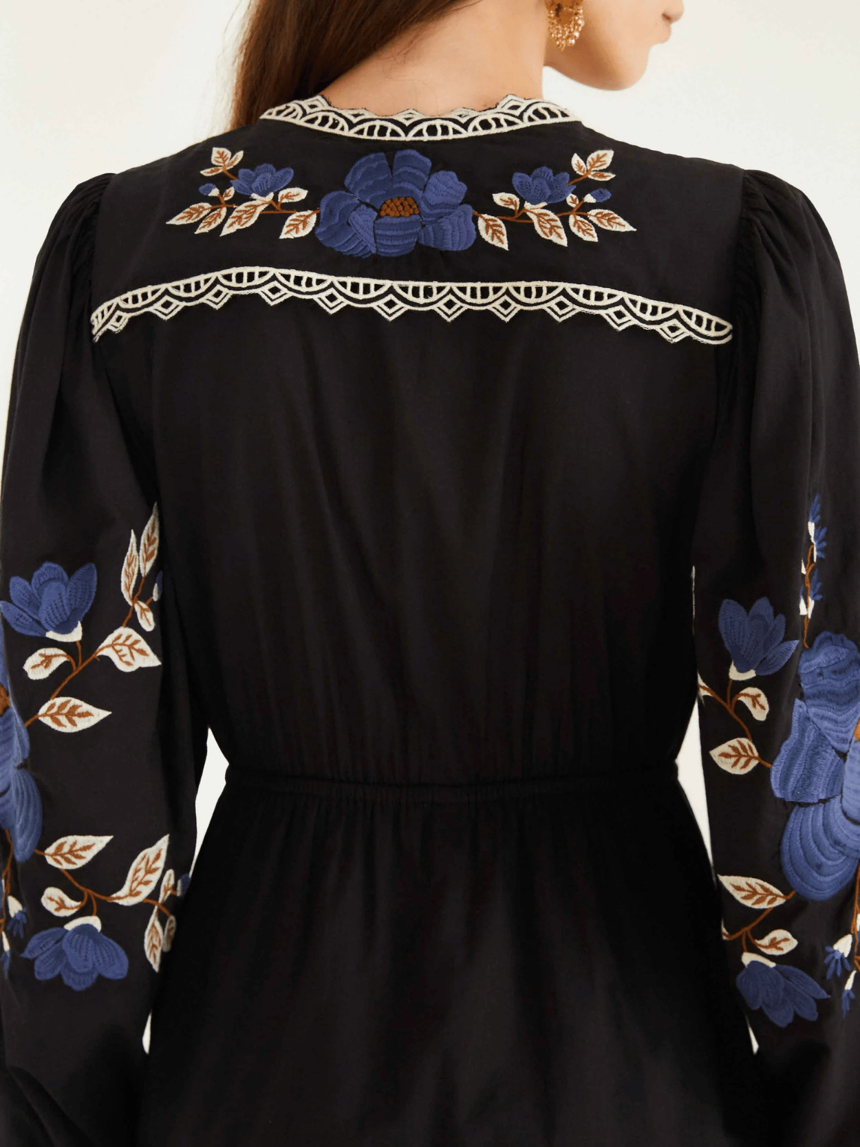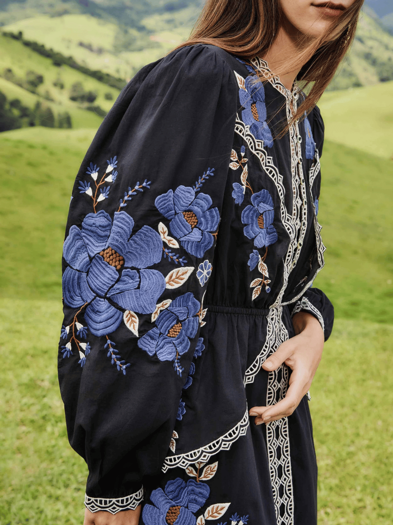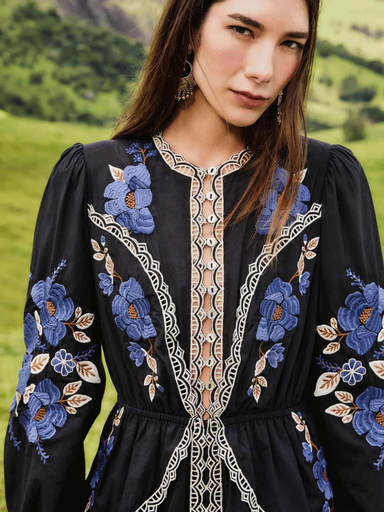 Das bestickte Midikleid von Farm Rio vereint elegante Boho-Romantik mit luxuriösem Handwerksdesign. Der tiefschwarze Stoff wird von leuchtend blauen Blumenstickereien und feinen Spitzenbesätzen geschmückt – ein stilvoller Kontrast, der pure Raffinesse ausstrahlt. Mit seiner taillierten Silhouette und den voluminösen Ärmeln ist dieses Boho Midikleid die ideale Wahl für elegante Auftritte und moderne Frauen mit Sinn für das Besondere.