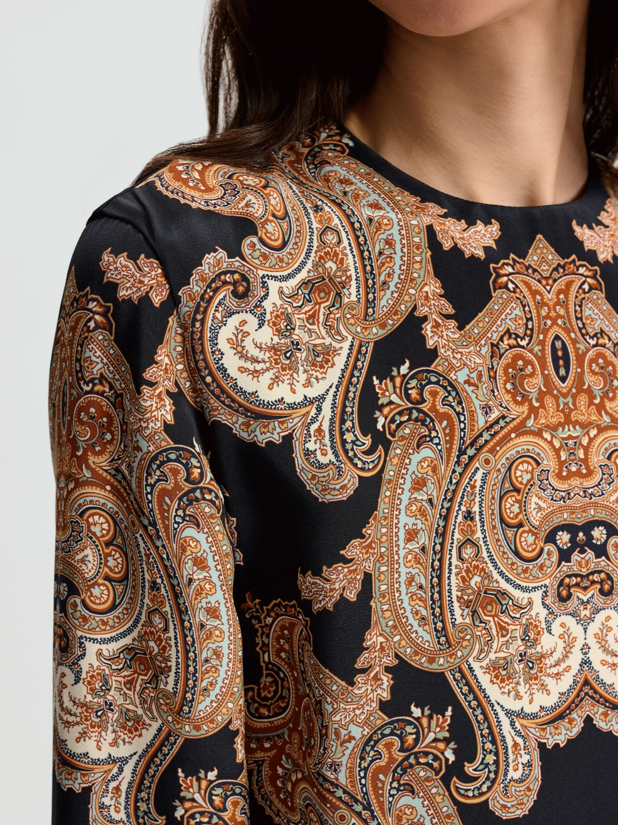 Veronica Beard's Lupita Paisley dress combines luxurious georgette silk blend with a striking, graphic paisley pattern. The figure-hugging, diagonally cut drape and elegant bell sleeves create a flattering silhouette and subtle drama. Perfect for dinner, dates, or special occasions – a statement piece that is sure to turn heads.