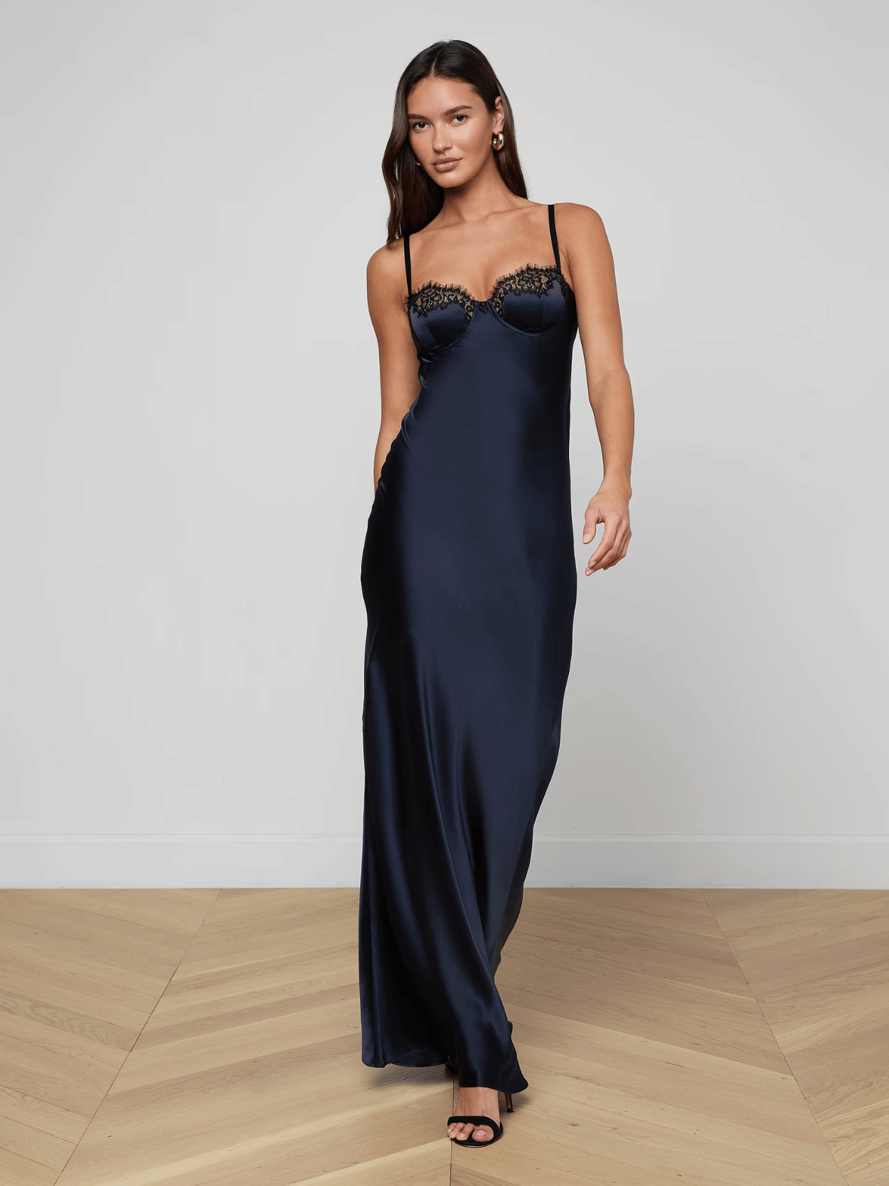 The Shayla maxi dress from L'AGENCE combines luxurious silk with delicate, boudoir-inspired lace for an elegant, sensual look. The pre-formed cups with classic hook-and-eye closure offer optimal support, making additional underwear unnecessary. Perfect for special occasions – this elegant evening dress guarantees a stylish appearance with maximum comfort.