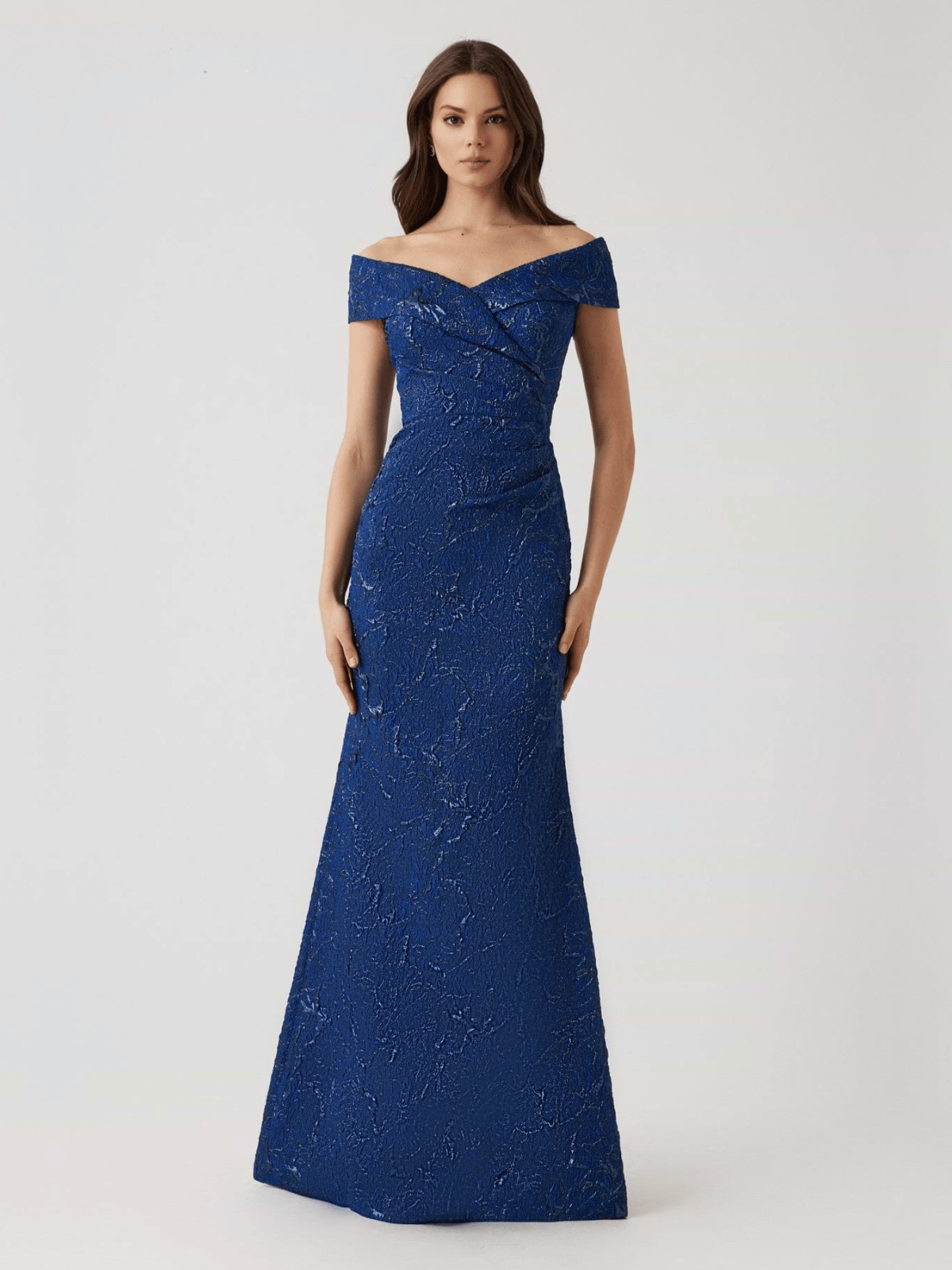 Das Metallic Navy Abendkleid von Teri Jon verzaubert mit seinem edlen Jacquardstoff in metallischem Glanz und einer femininen, formschlüssigen Silhouette. Der schulterfreie Ausschnitt mit zarten Flügelärmeln und die elegante Raffung an der Taille betonen die Figur auf stilvolle Weise – perfekt für glamouröse Abende und festliche Anlässe.