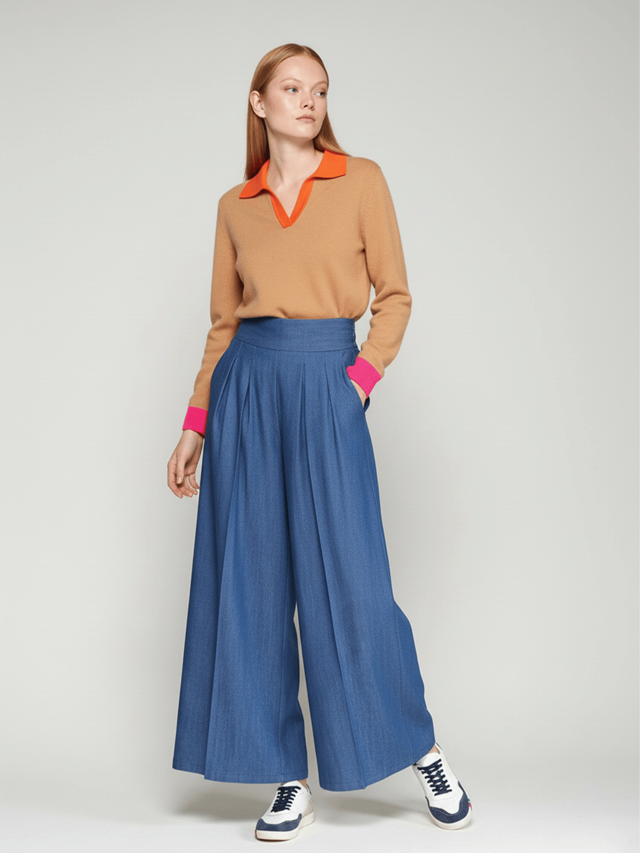 Dieser Pullover von Vilagallo überzeugt durch seine raffinierte Farbgestaltung und hochwertige Qualität. Der camelfarbene Feinstrick erhält durch den kontrastierenden Polokragen und Saum in Orange sowie fuchsiafarbene Bündchen einen modernen, frischen Look. Gefertigt aus 100 % Wolle, bietet er eine weiche, warme Haptik und hohen Tragekomfort. Ideal für stilvolle Alltagslooks – ob zu Jeans, eleganter Stoffhose oder Rock.