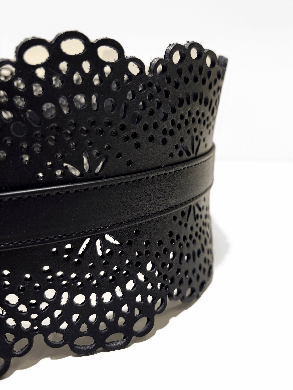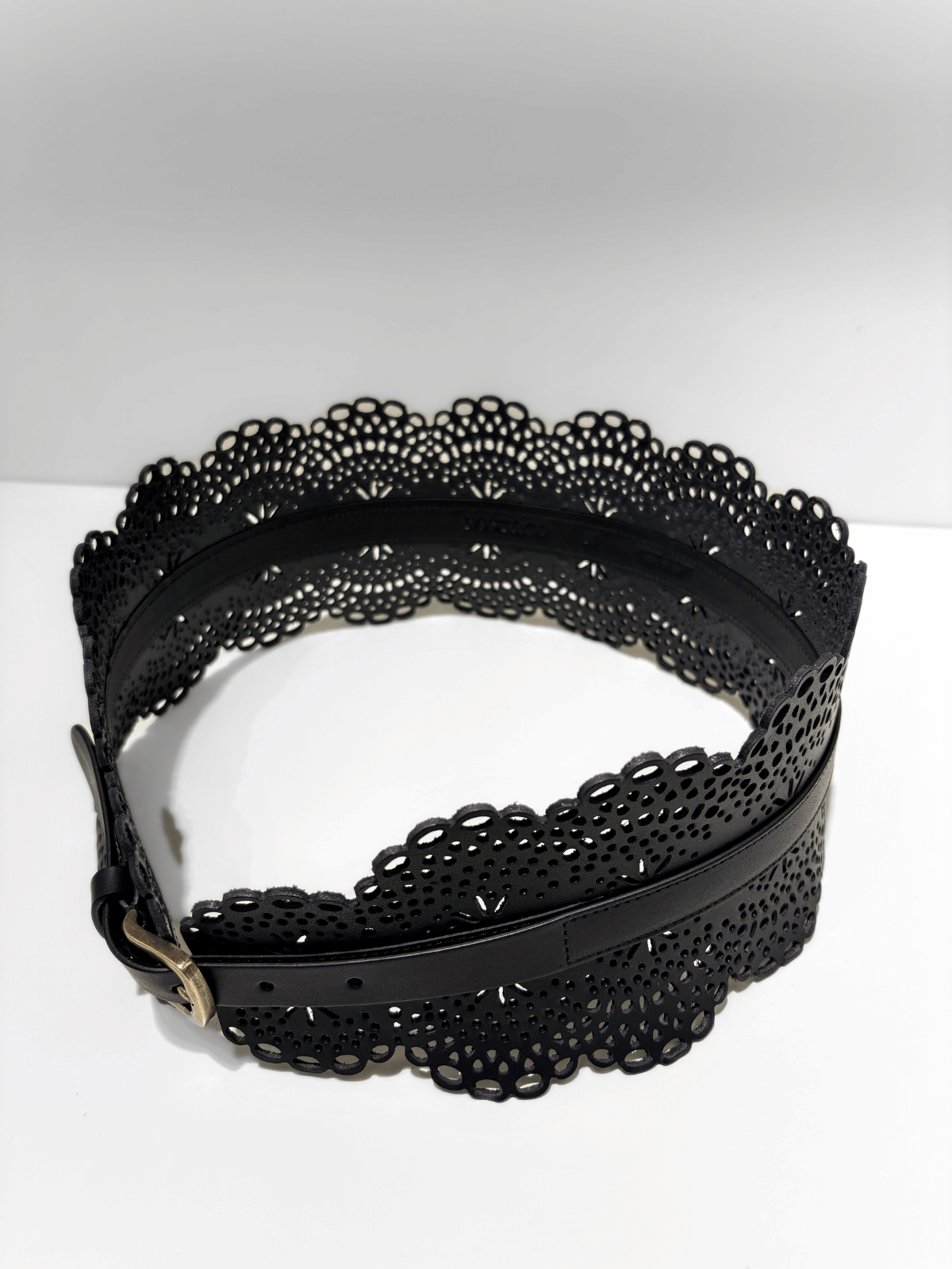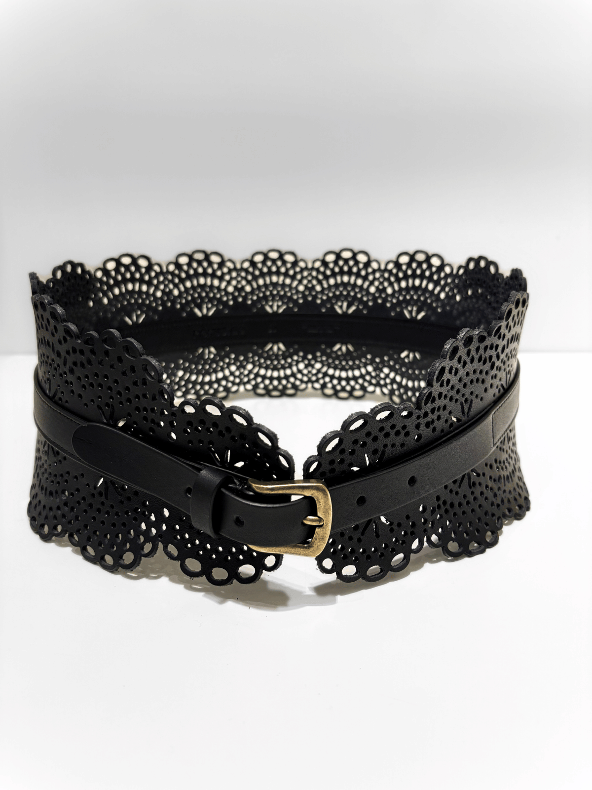 Der handgefertigte Taillengürtel aus Leder von Post & Co. besticht durch seine außergewöhnliche, lasergeschnittene Lochverzierung.In Schwarz gehalten, verleiht er jedem Outfit feminine Eleganz und italienische Handwerkskunst. Er ist perfekt, um Kleider oder Blusen stilvoll zu akzentuieren.