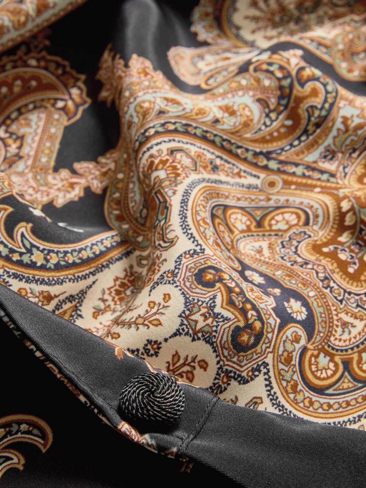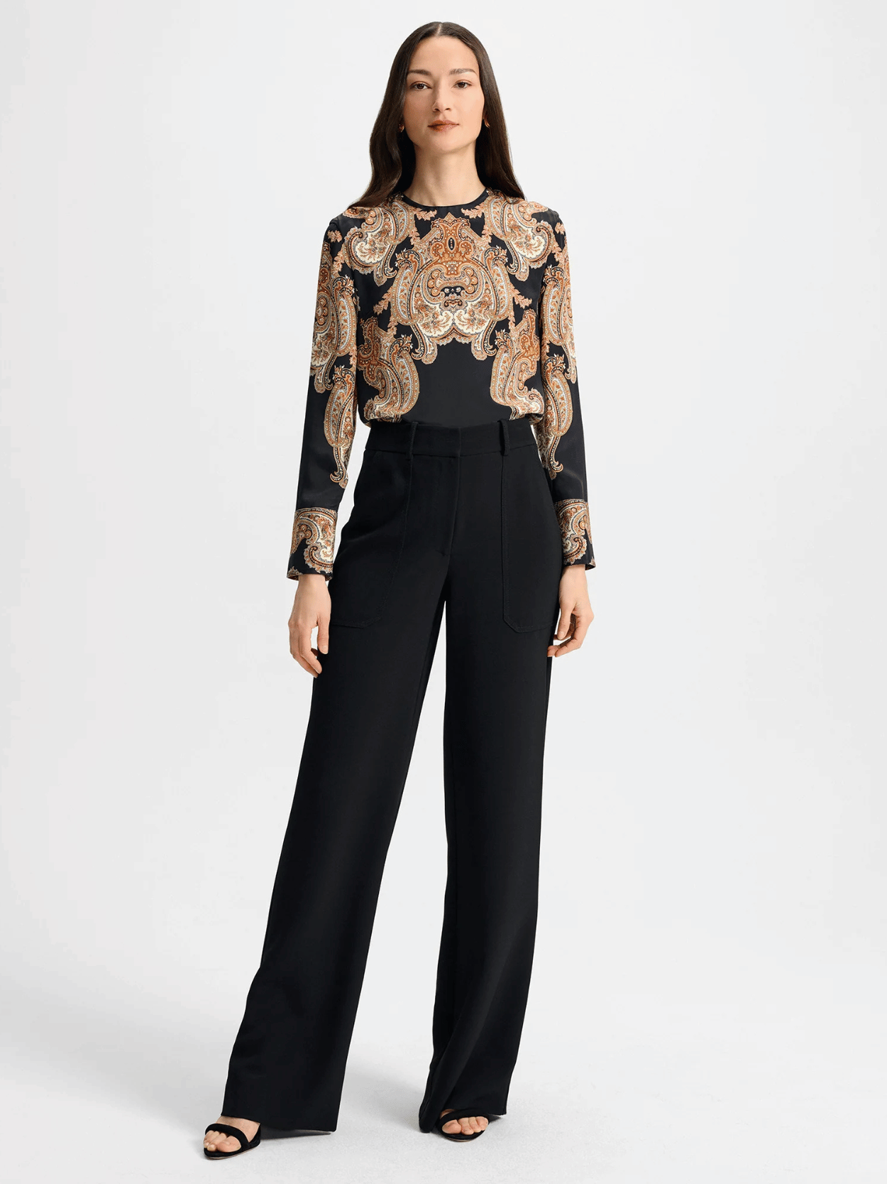 Die Karisse Seidenbluse von Veronica Beard verbindet luxuriöse Seidenmischung mit einem markanten beigefarbenen Paisley-Print. Mit Rundhalsausschnitt, entspannter Passform und breiten Ärmelbündchen ist sie ein stilvolles Statement-Piece, das Eleganz und Lässigkeit vereint. Vielseitig kombinierbar – ob zu Jeans, maßgeschneiderter Hose oder Minirock.