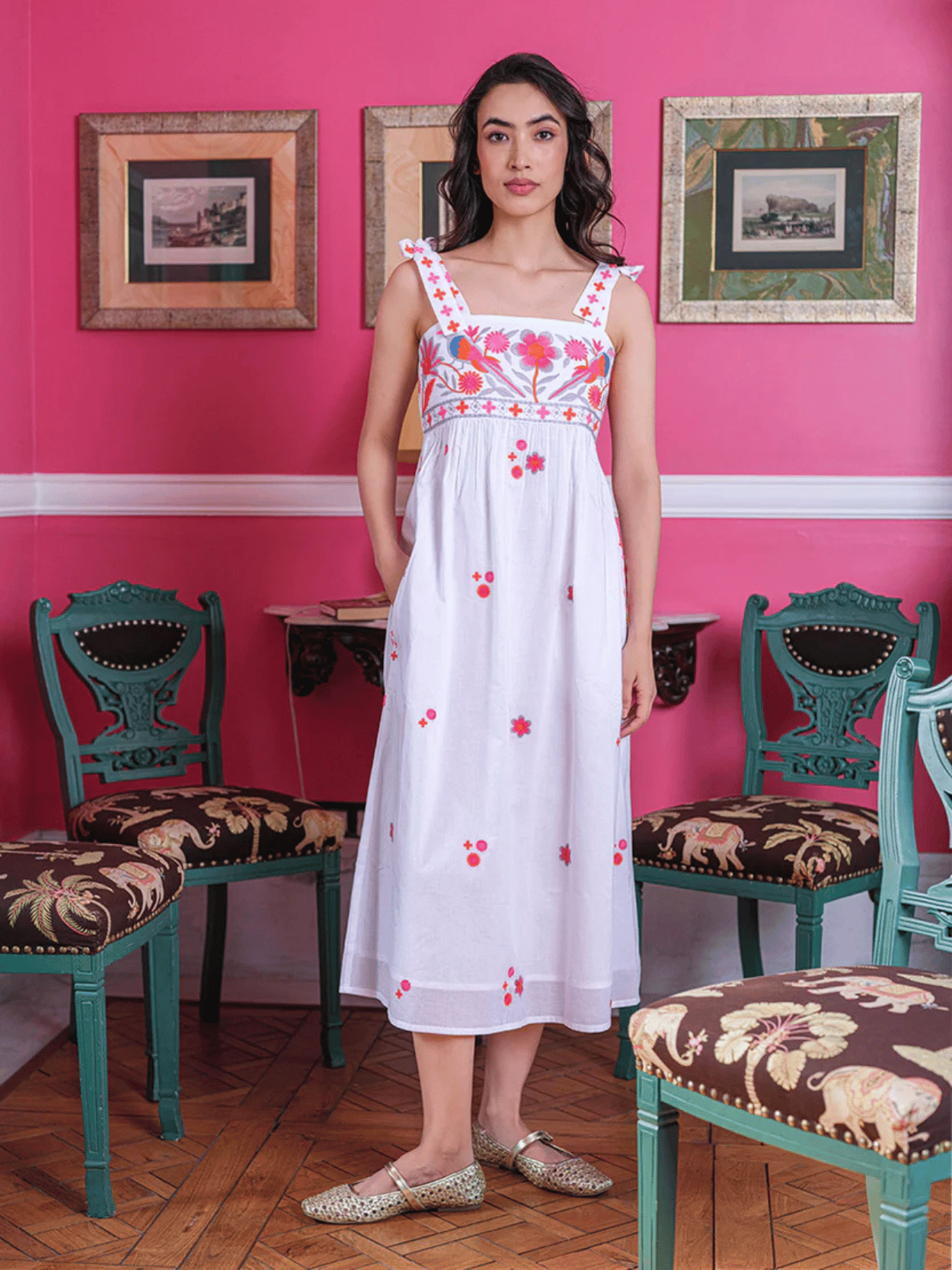 The Agate midi dress from Nimo is a delightful, airy summer slip dress with charming floral embroidery and a feminine silhouette. Wide tie straps and a smocked back ensure a customized fit and exceptional comfort, while the flowing midi design lends the look a light and elegant feel. Perfect as a stylish beach dress for warm, sunny days.