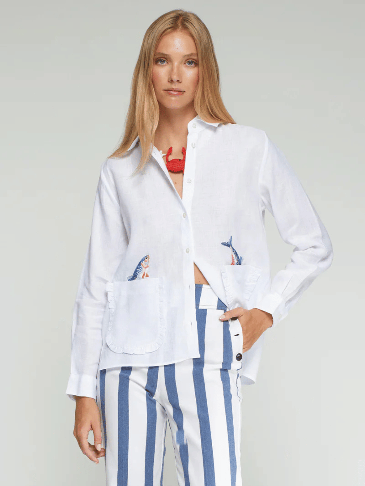 This white linen blouse from Vilagallo brings a playful, nautical touch with embroidered fish motifs on the front pockets. Delicate ruffles, a classic shirt collar, and a full button placket lend the design a feminine lightness. Airy, stylish, and perfect for summer looks.